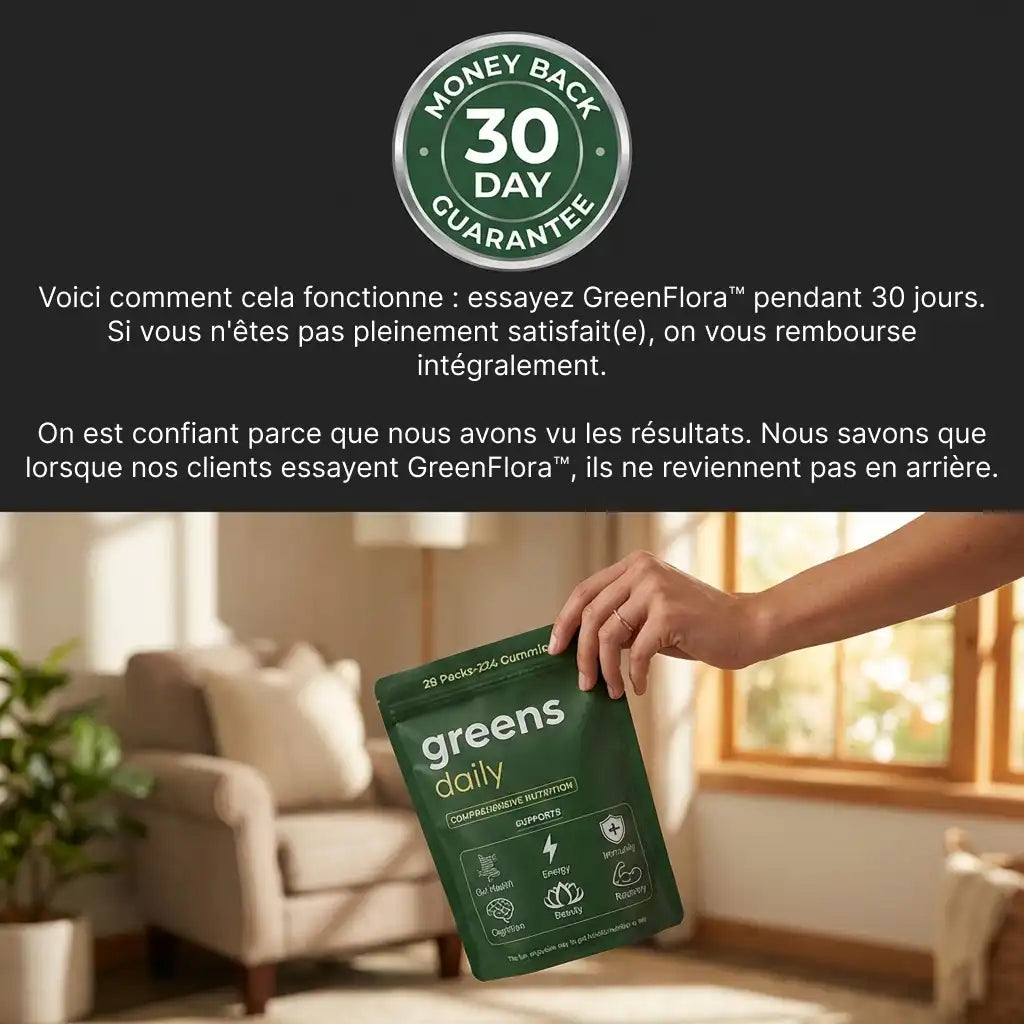 Voici comment cela fonctionne : essayez GreenFlora™ pendant 30 jours. Si vous n'êtes pas pleinement satisfait(e), on vous rembourse intégralement.